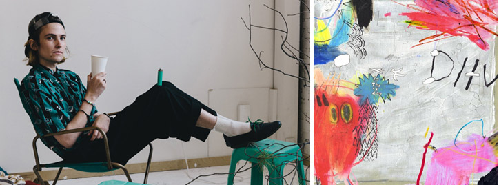 beest met grote bek, ongeschoren oksels en expressionistische kledij.